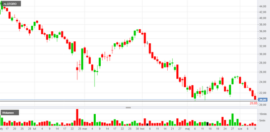 Notowania właściciela platformy zniżkują o 2,7 proc., do 20,8 zł. Kurs spółki zbliża się do historycznych minimów, ustanowionych na początku maja.