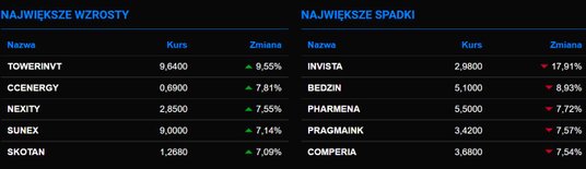 Najmocniej drożeją dziś walory Tower Investments, o blisko 10 proc. Z kolei notowania Invisty tracą blisko 18 proc.