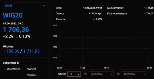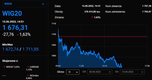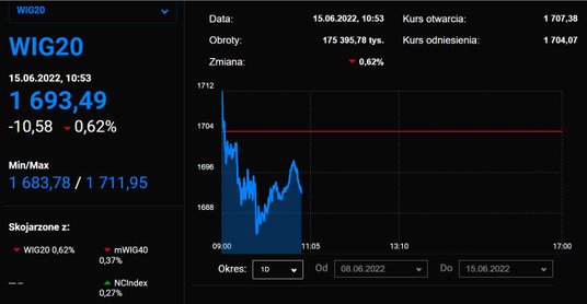 Mimo że na początku sesji widoczna była przewaga byków, to już po chwili indeks największych spółek zanurkował. Obecnie spada o 0,6 proc. i znajduje się na poziomie 1693 pkt. Najmocniej spadają notowania Dino, o ponad 3 proc., a LPP zniżkuje o około 2,5 proc. Odzieżowy gigant opublikował wczoraj po sesji raport za I kwartał roku obrotowego 2022/23. Zysk operacyjny wyniósł 186,6 mln zł i był niższy niż wcześniejsze szacunki spółki, które zakładały, że sięgnie on 205 mln zł.