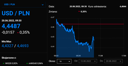 Złoty jest nieznacznie słabszy względem euro. Równocześnie umacnia się względem amerykańskiej waluty. Za euro inwestorzy płacą nieco ponad 4,68 zł, zł, frank szwajcarski kosztuje ok. 4,60 zł, a dolar wyceniany jest nieco poniżej 4,45 zł.