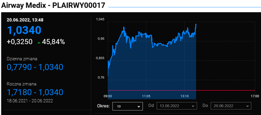 Przypomnijmy, w ubiegłym tygodniu Airway poinformował rynek, że prowadzi negocjacje z potencjalnym inwestorem z USA w sprawie sprzedaży swojej technologii. Nie podano, jaką wartość może mieć umowa, a wszystko ma się rozstrzygnąć w ciągu dwóch miesięcy.