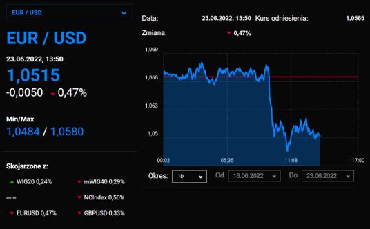 Dzień z umocnieniem dolara. Główna para walutowa spada o około 0,5 proc. Euro nie pomagają dzisiaj przede wszystkim słabe odczyty indeksów PMI. Na celowniku jest teraz okrągły poziom 1,05.
