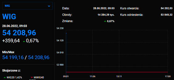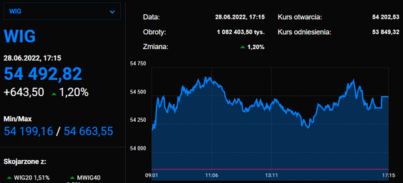 Indeks szerokiego rynku zakończył wtorkową sesję na 1,2-proc. plusie. Duże wsparcie otrzymał od WIG20, który ostatecznie zyskał 1,5 proc. Kroku dużym spółkom starały się dotrzymać średnie i małe. Indeks mWIG40 zyskał 0,5 proc., podczas gdy sWIG 80 wzrósł o 0,4 proc. Zaskoczeniem mogą być obroty, których wartość sięgnęła niemal 1,1 mld zł.