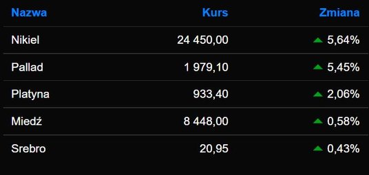 Podczas dzisiejszej sesji obserwujemy wzrost cen metali, zarówno przemysłowych jak i szlachetnych. Notowania niklu i palladu idą w górę po ponad 5 proc.