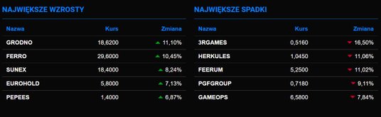 Na dużej giełdzie najlepiej radzi sobie dziś Grodno. Notowania spółki rosną o ponad 11 proc. Po drugiej stronie tabeli jest 3R Games, którego walory tanieją o ponad 16 proc.