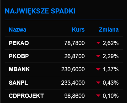 Mimo sprzyjających nastrojów na zagranicznych parkietach, na krajowym rynku akcji coraz więcej do powiedzenia mają sprzedający. W efekcie WIG i WIG20 zostały zepchnięte epod kreskę. Tempa nabiera wyprzedaż akcji banków. Pekao i PKO BP zwiększyły stratę do ponad 4 proc., najmocniej ciążąc głównym indeksom. Chętnie pozbywano się także papierów CD Projektu.
