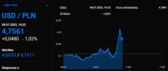 O poranku cena euro przekroczyła psychologiczną barierę 4,8 zł, z kolei jeszcze mocniej w siłę rośnie dolar, za którego trzeba zapłacić ponad 4,75 zł. Mocne wzrosty dotyczą też franka szwajcarskiego, za którego płacono 4,86 zł. Słabość rodzimej waluty związana jest z trudną sytuacją gospodarczą europejskiej gospodarki spowodowaną rosnącymi cenami energii oraz widmem kryzysu energetycznego nadchodzącej zimy.