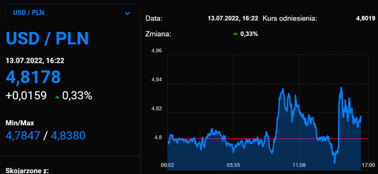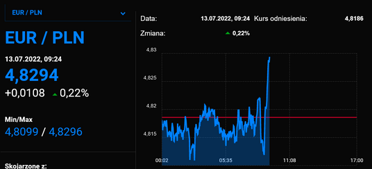 Dane o inflacji w USA umocniły amerykańską walutę , która jest bardzo, bardzo blisko parytetu względem euro. Równocześnie osłabienie złotego względem kluczowych walut nabrało tempa. Za euro inwestorzy płacą już prawie 4,84 zł, zł, frank szwajcarski kosztuje ok. 4,93 zł, a dolar wyceniany jest nieco powyżej 4,83 zł.