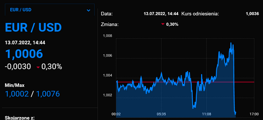 Za jedno euro płacono, niedługo po publikacji raportu o amerykańskiej inflacji, 0,9998 USD. Po raz pierwszy od 2002 r. euro jest warte mniej od dolara.