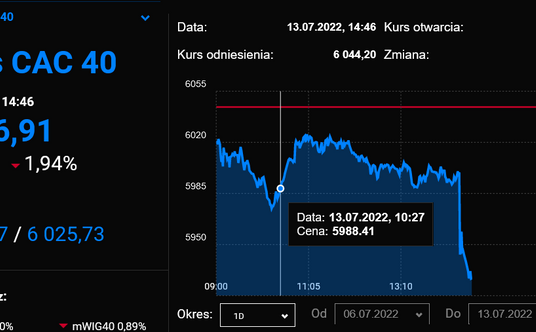 W środę europejskie indeksy zanurkowały. Spadkom przewodziły największe zachodnioeuropejskie parkiety, gdzie przecena indeksów, tuż po publikacji danych o amerykańskiej inflacji, sięgała nawet 2 proc., ale w końcówce sesji straty udało się nieco ograniczyć. Główny indeksy giełdy we Frankfurcie DAX zakończył notowania spadkiem o prawie 1,2 proc, francuski CAC40 stracił ponad 0,7 proc., a londyński FTSE100 zniżkował o ponad 0,7 proc.