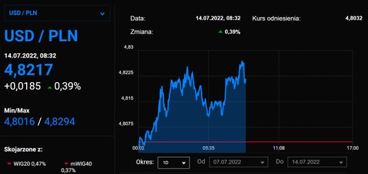 Złoty kontynuuje swoją passę osłabiania się wobec amerykańskiej waluty. Dziś kurs USD/PLN rośnie o blisko 0,4 proc., do ponad 4,82 zł. Złoty osłabia się także wobec innych walut. Za euro trzeba zapłacić ponad 4,83 zł, a za franka ponad 4,9 zł.