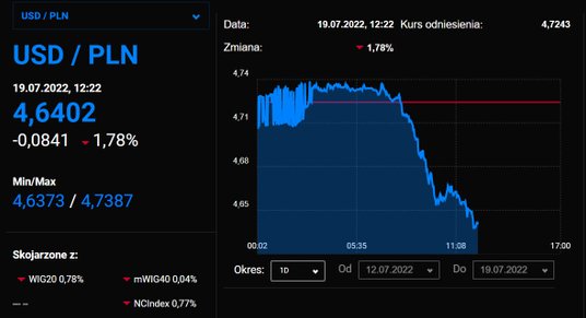 Słabszy dolara pomaga także notowaniom złotego. Ten do "zielonego" umacnia się dzisiaj o ponad 1 proc. i USD/PLN jest już przy poziomie 4,65. Mniejszy ruch widzimy natomiast na parze EUR/PLN. Tutaj złoty umacnia się o 0,4 proc. do poziomu 4,77 zł.
