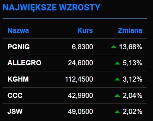 Bez wątpienia jedną z największych gwiazd dzisiejszej sesji jest firma PGNiG. Po ujawnieniu szczegółów na temat połączenia z PKN Orlen (akcjonariusze PGNiG mają dostać 0,0925 akcji paliwowej spółki), papiery drożeją o około 13 proc. Obroty na akcjach tej firmy przekroczyły już 60 mln zł. PGNiG jest najmocniejszą spółką w WIG20, ale dobrze radzi sobie także Allegro czy też KGHM. Akcje tej pierwszej firmy zyskują ponad 5 proc., drugiej ponad 3 proc.