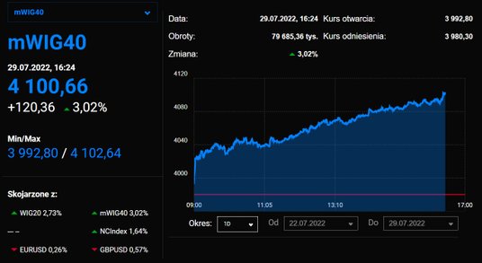 Zielono aż miło na GPW. Chociaż WIG20 zyskuje ponad 2,5 proc. to jeszcze lepiej prezentuje się mWIG40. Rośnie ponad 3 proc. i jest powyżej 4100 pkt.
