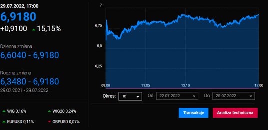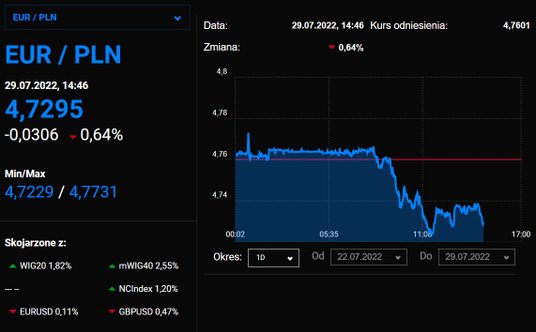 Nasza waluta zaczęła dzień od mocnego uderzenia. Względem dolara umacnia się o około 0,8 proc. i za amerykańską walutę trzeba płacić 4,63 zł. Euro kosztuje 4,74 zł o 0,4 proc. mniej niż wczoraj. Pomagają lepsze nastroje rynkowe i podbicie notowań pary EUR/USD. Czekamy jednak na odczyt dotyczący inflacji który może być kluczowy dla naszej waluty.