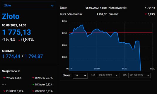 Dobre dane i mocny dolar przełożyły się także na spadki cen metali szlachetnych. Złoto oddala się od 1800 USD za uncję. Obecnie traci około1 proc.