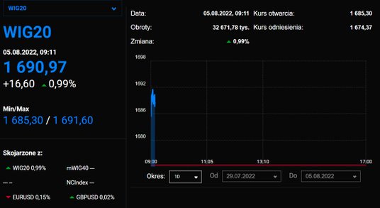 Udane otwarcie notowań, wspierane dobrymi wynikami PKN Orlen, pozwala spojrzeć z nieco większym optymizmem na rzeczywistość rynkową. Jeśli dobre nastroje się utrzymają jest szansa na to, że WIG20 zaatakuje dzisiaj znowu poziom 1700 pkt. Wcale nie brakuje do tego, aż tak wiele.