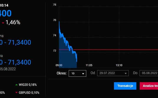 "Czarne złoto" w ostatnich dniach nie ma dobrej passy. Zarówno odmiana WTI i Brent najpierw zjechały poniżej 100 USD za baryłkę. WTI złamało nawet poziom 90 USD. Dzisiaj rano mieliśmy próbę odreagowanie, ale obecnie niewiele już z niej pozostało. Ropa WTI kosztuje 88 USD, a Brent 94 USD.
