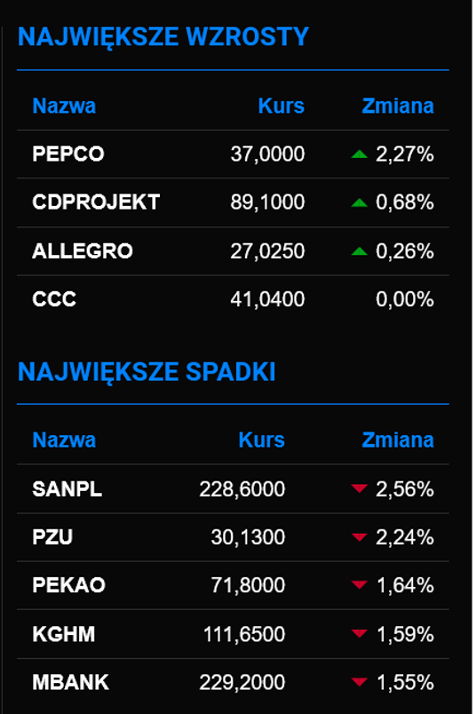 Inwestorzy handlujący na giełdzie w Warszawie chętnie pozbywają się akcji największych spółek. Przecena objęła niemal cały indeks WIG20 z wyjątkiem papierów Allegro, Pepco i CD Projektu. Biorąc pod uwagę zasięg spadków negatywnie wyróżniają się akcje banków, które zniżkują nawet o prawie 3 proc. (Santander BP) oraz KGHM, które tracą niemal 2 proc. w ślad za zniżkującymi cenami miedzi.