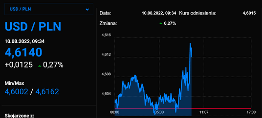 Fala optymizmu poniosła także złotego, który po danych o inflacji w USA wrócił do łask inwestorów. Inwestorzy nabrali większego apetytu na ryzykowne aktywa, co umocniło go względem kluczowych walut. Za euro trzeba płacić ok. 4,68 zł, frank szwajcarski kosztuje prawie 4,82 zł, a dolar wyceniany jest nieco powyżej 4,54 zł. Tak tanich euro i dolara nie notowano od niemal początku trwających wakacji.