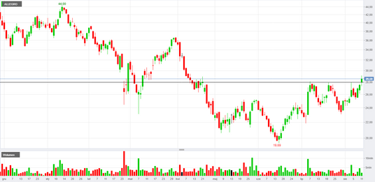 Allegro po kilku próbach w końcu przełamuje poziom 28 zł. W czwartek zwyżkuje o 4,3 proc., do 28,7 zł.