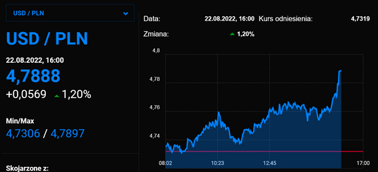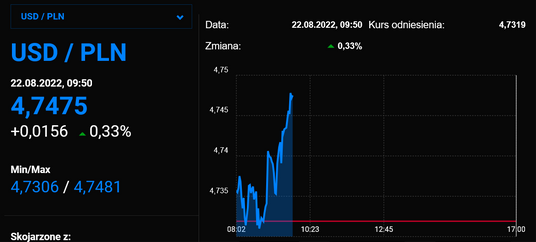 Globalna ucieczka inwestorów od ryzykownych aktywów negatywnie przekłada się na notowania złotego. Za euro inwestorzy płacą nieco ponad 4,76 zł, zł, frank szwajcarski kosztuje ponad 4,96 zł, a dolar wyceniany jest po ok 4,75 zł.