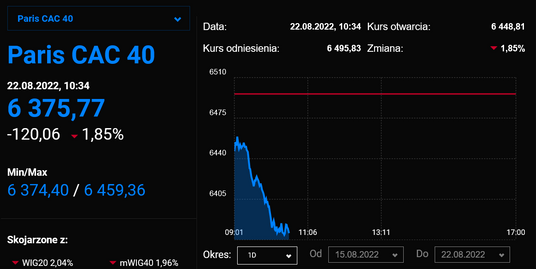 Akcje notowane europejskich parkietach znalazły się na celowniku sprzedających. Niemiecki DAX zakończył poniedziałkowe notowania spadkiem o prawie 2,4 proc, francuski CAC40 stracił niemal 2 proc., a wskaźnik giełdy w Londynie FTSE250 poszedł w dół o prawie 2 proc. Przecena na giełdach to efekt powrotu obaw inwestorów związanych z kryzysu energetycznym w Europie, po tym jak Gazprom poinformował o planowanym czasowym wstrzymaniu dostaw surowca do Niemiec przez Nord Stream 1.