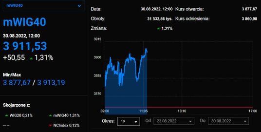 O ile próby odbicia w wykonaniu WIG20 są niemrawe, tak mWIG40 prezentuje się dzisiaj wyjątkowo dobrze. Zyskuje 1,3 proc. a jego głównym motorem napędowym są akcje Banku Handlowego, które drożeją już ponad 7 proc. Mocno wygląda też Wirtualna Polska, która jest 5 proc. na plusie.