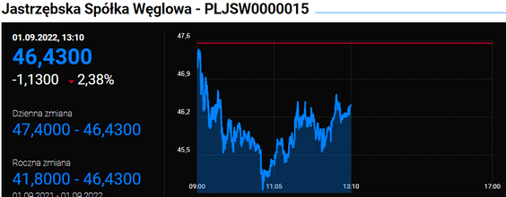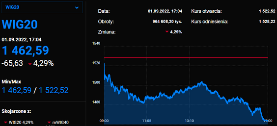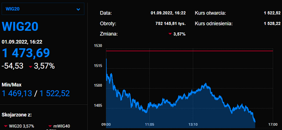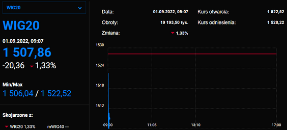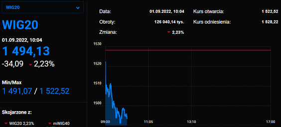Indeks największych spółek zjechał poniżej 1500 pkt. Pomijając początek pandemii, ostatnio tak nisko rodzimy indeks był w trakcie kryzysu finansowego na przełomie 2008 i 2009 r. Dziś indeks najbardziej dołują PGNiG oraz JSW.