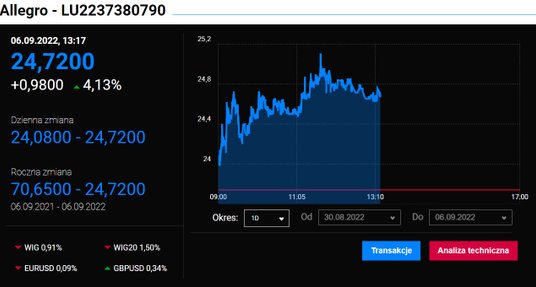 WIG20 cały czas je na wyraźnym minusie, a byłoby jeszcze gorzej gdyby nie mocna postawa papierów Allegro. Te drożeją dzisiaj o ponad 4 proc. co czyni je najmocniejszymi w WIG20. O plusy walczy jeszcze Asseco, chociaż w tym przypadku są one symboliczne.