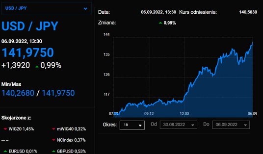 Kolejny dzień japońskiej waluty. Dzisiaj traci ona względem dolara około 1 proc. i para USD/JPY melduje się przy poziomie 142,00. Tak kończy się utrzymywanie luźnej polityki pieniężnej. Doskonale obrazuje to roczny wykres USD/JPY.