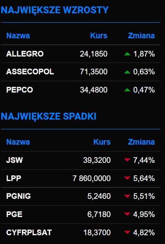 WIG20 zaliczył mocną przecenę. Grupie spadkowej przewodziły papiery JSW, które straciły 7,4 proc. Jedynie trzy spółki obroniły się przed spadkami. Mowa o Allegro, Pepco i Asseco Poland.