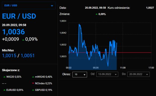 Główna para walutowa oscyluje w tym tygodniu cały czas w okolicach parytetu. Nie ma jednak się temu co dziwić. Inwestorzy czekają na środową decyzję Rezerwy Federalnej w sprawie stóp procentowych. Scenariusz bazowy mówi o podwyżce o 75 pkt bazowych.