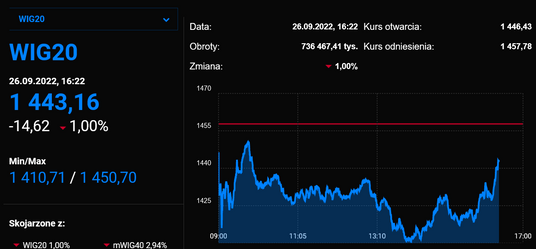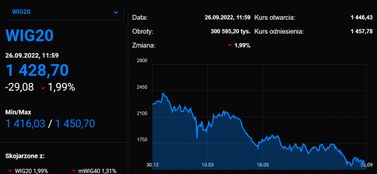 Poniedziałkowa sesja na giełdzie w Warszawie przebiega pod znakiem przeceny. W efekcie indeks największych spółek WIG20 tracił już nawet prawie 3 proc. ustanawiając nowy rekord słabości (1416 pkt) w trakcie trwającej bessy. W efekcie jego tegoroczna strata pogłębiła się do ponad 37 proc. Nowy dołek notowań w tym roku zaliczył także szeroki indeks WIG, schodząc poniżej 47 tys. pkt. Tym samym tylko od początku tego roku stracił już niemal jedną trzecią swojej wartości.