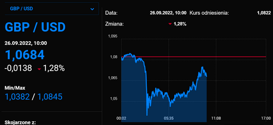 Kurs funta brytyjskiego w poniedziałek rano zaliczył potężny spadek do dolara osiągając poziom nieco ponad 1,03 USD. Tak nisko nie był notowany od ponad 50 lat. Wyprzedaż funta była reakcją na ogłoszony w piątek przez Kwasi Kwartenga, brytyjskiego ministra finansów, który ogłosił w piątek szeroko zakrojone cięcia podatków.