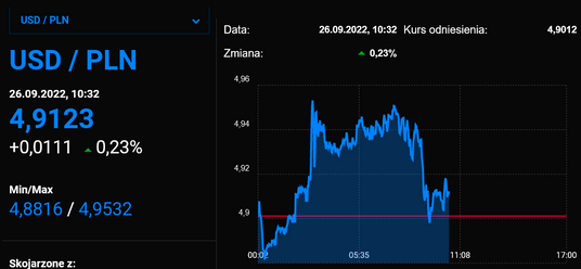 Złoty lekko umacnia się względem najważniejszych walut, odrabiając straty po porannym osłabieniu, które wyniosło kurs dolara na nowy szczyt na poziomie 4,96 zł. W taj chwili. Za amerykańską walutę trzeba płacić prawie ok. 4,91 zł, zł, frank szwajcarski kosztuje ok. 4,99 zł, a euro wyceniane jest nieco ponad 4,75 zł.