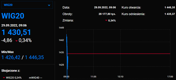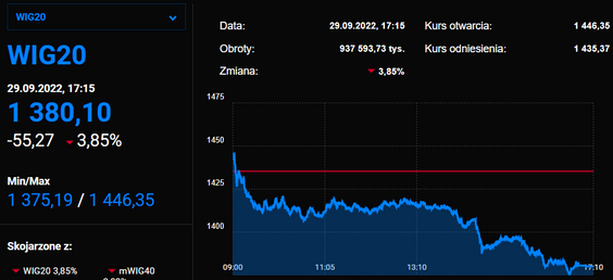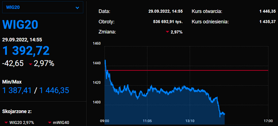 Na dwie godziny przed końcem sesji indeks najbardziej płynnych firm spada o 3 proc. i jest poniżej psychologicznego poziomu 1,4 tys. pkt. Tym samym osunął się niżej niż w czasie pandemii w 2020 r. Ostatnio na podobnych poziomach był w czasie kryzysu finansowego w latach 2008-2009.