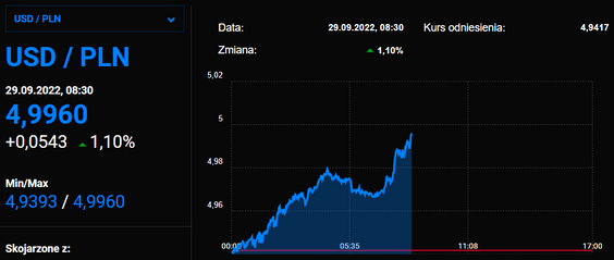 O poranku dolar umacnia się względem rodzimej waluty o ponad 1 proc., zbliżając się ponownie do poziomu 5 zł. Dolar umacnia się także względem euro. Obecnie za jedno euro trzeba zapłacić ponad 0,96 dolara. Złoty nieciekawie prezentuje się też względem euro. Za walutę Wspólnoty płacono prawie 4,83 zł. Kolejnej dawki zmienności jeśli chodzi o rodzimą walutę należy spodziewać się jutro. O godzinie 10 poznamy szybki szacunek inflacji we wrześniu.