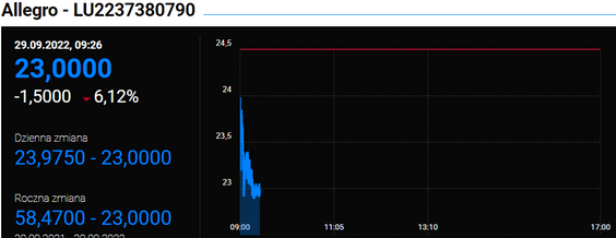 Zbliża się koniec III kw., a spółki nadal publikują raporty dotyczące pierwszych sześciu miesięcy roku. Wczoraj wieczorem oraz dziś rano raporty ukazała m.in. Grupa Azoty, Celon Pharma czy Allegro. Ostatnia z wymienionych firm traci o poranku ponad 6 proc., a obroty walorami firmy są największe na GPW. Jest to efekt obniżenia prognoz dotyczących tegorocznych wyników. Wskaźnik GMV (łączna wartość sprzedanych towarów) ma wzrosnąć o 15-17 proc., a przychody - 23-26 proc.