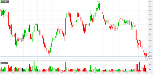 Akcje Allegro tracą dziś około 1 proc., do 19,3 zł. Jeśli dzisiejsza sesja zakończy się dla spółki na czerwono, będzie to szósty z kolei dzień spadków.