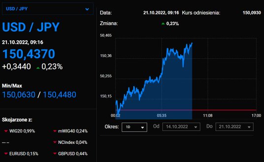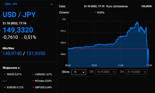 Trwa przecena japońskiej waluty. Para walutowa USD/JPY przebiła okrągły poziom 150,00. Od początku roku jen osłabił się wobec dolara ponad 30 proc. co jest efektem utrzymywania luźnej polityki pieniężnej w Japonii.