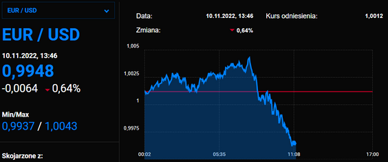 Amerykańska waluta zyskiwała przed ogłoszeniem październikowych danych dotyczących inflacji w USA. Za euro płacono mniej niż jednego dolara. Podobnie sytuacja wyglądała w przypadku złotego. Rodzima waluta słabła po południu o 0,6 proc., a za dolara płacono 4,73 zł.