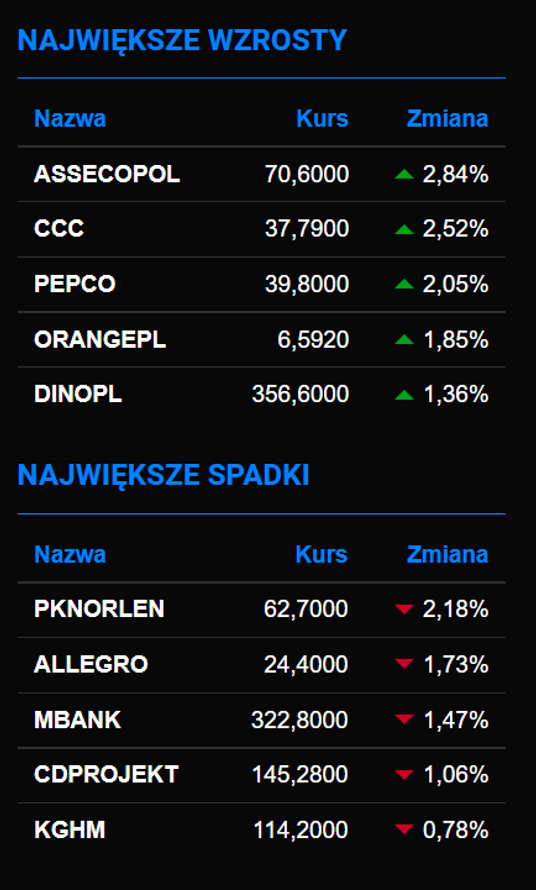 W gronie największych spółek błysnęła dzisiaj firma Asseco Poland, której akcje urosły prawie 3 proc. Ponad 2 proc. zyskały z kolei papiery CCC i Pepco. Na drugim biegunie był PKN Orlen, który stracił ponad 2 proc.
