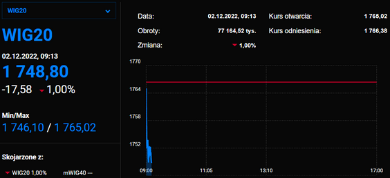 Pierwsze minuty sesji przyniosły spadki WIG20 sięgające 1,1 proc. Podobnie sytuacja wygląda na innych europejskich parkietach. Inwestorzy wyczekiwać będą danych z amerykańskiego rynku pracy, które mogą okazać się dalszą wskazówką dla Fedu dotyczącą podwyżek stóp procentowych.