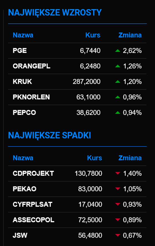 Przewaga głównych indeksów w Warszawie wyraźnie stopniała. WIG20 już tylko balansuje na kresce. Największe krajowe spółki radzą sobie w poniedziałek ze zmiennym szczęściem. Popyt jest aktywny głównie na papierach PGE, PKN Orlen, Orange i Kruka. Przeciwwagę stanowią dla nich taniejące akcje banków, CD Projektu i Allegro.