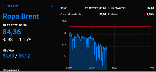 Głównym wydarzeniem na rynku ropy naftowej jest długo wyczekiwana reakcja władz Rosji na wprowadzone przez państwa G7 na początku grudnia limity cenowe dla handlu rosyjską ropą. - Po przedłużonym weekendzie świątecznym, ostatni tydzień bieżącego roku na tym rynku jest mało dynamiczny. Notowania ropy naftowej Brent oscylują wciąż w okolicach 84-85 USD za baryłkę, a cena ropy WTI porusza się w rejonie 79-80 USD za baryłkę. Dzisiaj na rynku tym widać delikatną presję podaży – zauważa Dorota Sierakowska, analityk DM BOŚ.