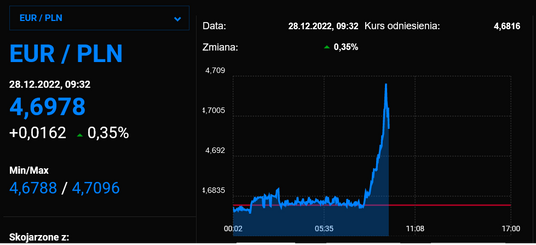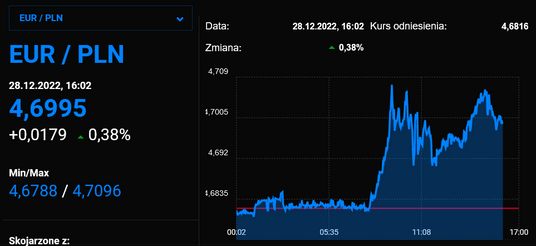 Złoty drugi dzień z rzędu wyraźnie tracił na wartości względem kluczowych walut, mimo słabszego dolara, co z reguły był czynnikiem wspierającym rodzimą walutą. Za euro trzeba płacić ok. 4,70 zł, frank szwajcarski kosztuje nieco ponad 4,76 zł, a dolar prawie 4,41 zł. Słabość polskiej waluty można wprawdzie próbować tłumaczyć korektą silnych przedświątecznych zwyżek i chęcią zamykania pozycji przez inwestorów przed końcem roku, ale bardziej racjonalnym powodem wydaje się być obawy związane z możliwą interwencja NBP mająca na celu osłabienie złotego.