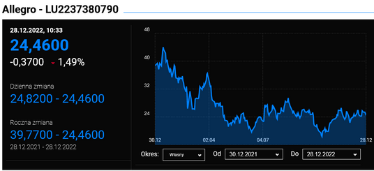 Końcówka roku fatalnie układa się dla posiadaczy akcji Allegro. Dziś tracą ok. 1,5 proc. będąc najsłabsza spółką w indeksie WIG20. Jest to już czwarta sesja spadkowa z rzędu. Tym samym strata liczona od początku 2022 roku powiększyła się do ponad 36 proc.