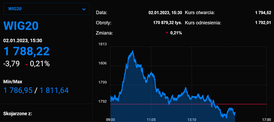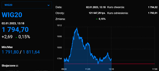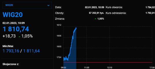 Pierwsza sesja w 2023 roku na warszawskiej giełdzie rozpoczyna się od zwyżek głównych indeksów, czemu sprzyjają dobre nastroje na zagranicznych rynkach akcji. WIG20 rośnie o 0,1 proc. proc. Kolor zielony przeważa również na szerokim rynku akcji.