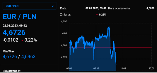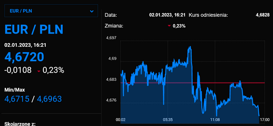 W trakcie pierwszego dnia handlu w 2023 roku polska waluta wróciła do łask inwestorów i umocniła się względem najważniejszych walut. Za euro inwestorzy płacą 4,67 zł, frank szwajcarski kosztuje ok. 4,73 zł, a dolar prawie 4,38 zł. Do większego optymizmu skłoniły lepsze od prognozowanych grudniowe dane PMI dla polskiego przemysłu.